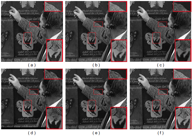 Fig. 3. Super-resolution results for Shields recovered by (b) Bi-cubic, (c) Method in Ref.[5], (d) MSR in Ref.[6],