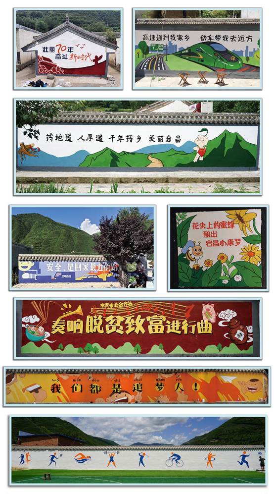 在16天的时间里,实践队结合宕昌县人文风情,在宕昌县内各乡镇主干道沿途,以“乡村振兴”、“产业扶贫”、“美丽宕昌”“新中国成立70年”等为主题,绘制了9面共计162平方米的文化墙。动画专业的同学们发挥专业特色,以画笔扮靓乡村,传递脱贫攻坚正能量。