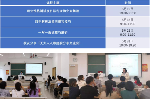 职业能力发展中心为学生提供就业技能培训,开设“职业能力提升”训练营,每年度开设8次课程,近300余人次参加培训。邀请校内外专业教师以小班辅导的形式针对学生需求精准授课,提高学生就业自信和综合能力;吸引校友、企业资源举办了七期“智算—SIF100”校企讲堂,与1000于名在校生分享行业发展和工作心得,发挥榜样育人和实践育人的作用,引导他们在成长成才的过程中能够将个人成长于祖国发展相结合,投入到逐渐国家伟大事业之中。