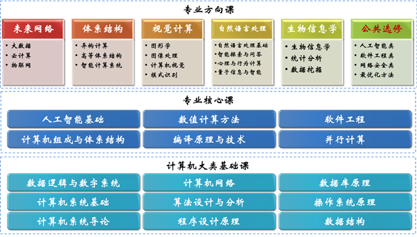 4) 专业方向选修课:分为未来网络、计算机体系结构、视觉计算、自然语言处理、生物信息学等五个方向,选修课内容各自围绕主题形成体系。