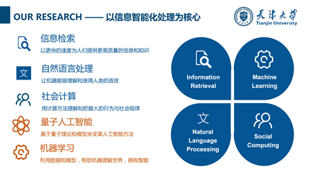 重点研究方向:量子人工智能、量子认知、量子计算、信息检索、自然语言处理、自然语言生成等方面的理论研究,以及在机器学习、深度学习、语言模型、搜索引擎、问答系统、社会计算等方面的应用研究。