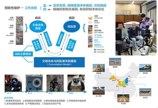 依靠计算视觉、模式识别、机器人、可视分析、精密仪器、自动控制、数据科学等多个信息技术方向以及与实验室仿真、传统理化监测手段的深入融合,研发各类无损或微损技术手段和装备,发现并测量各类型文物本体在真实赋存环境下缓慢发生的细微变化。过对本体和环境等监测数据进行协同分析,研究文物病害的发生机理,最终达到盘活历史监测数据,完善文物监测方法体系,推动文物预防性保护发展的目的。