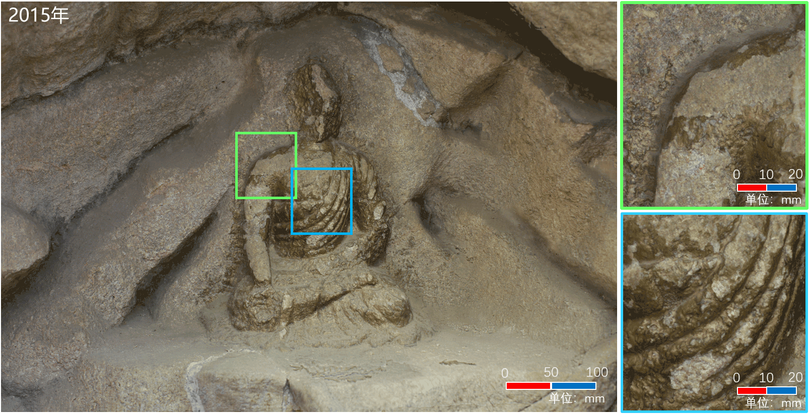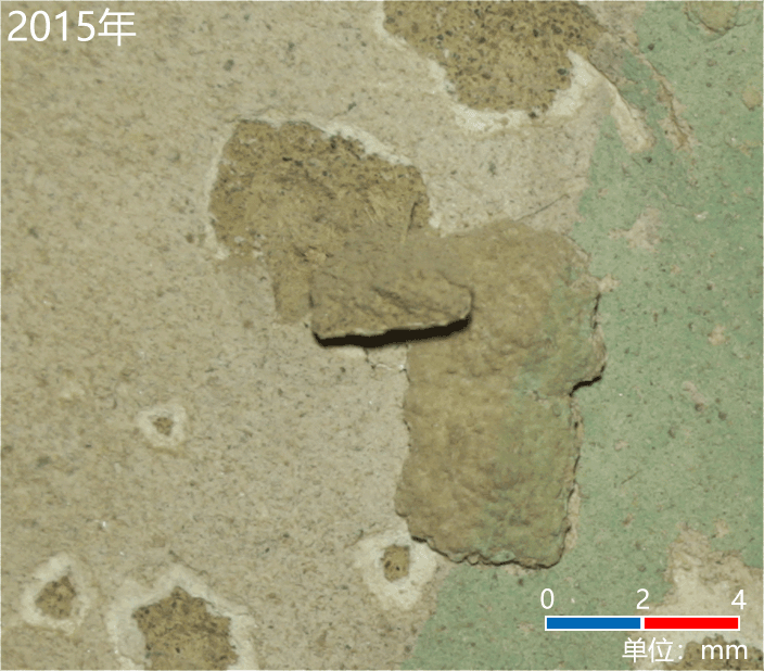 经过对敦煌莫高窟2014年至2018年部分壁画监测和分析后,团队首次发现了一年周期内的0.1毫米级壁画本体细微变化。