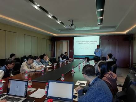 Jensen教授的报告指出地理空间丰富的语义及其对人们日常生活的重要性,使得相关的空间关键字查询尤为重要。Jensen教授通过实例,从top-k空间关键字查询、k阶近邻查询以及聚合查询三个方面详细讲述了如何进行空间关键字查询。Jensen教授提出应当使用索引和安全域来实现查询,其中安全域的计算需要按照边界距离顺序访问对象并使用IR-tree算法,最后删除多余的部分。该方法在地理文本数据连续查询、检索地理文本对象吸引力区域以及提取区域内对象属性等领域有很大的应用空间。
