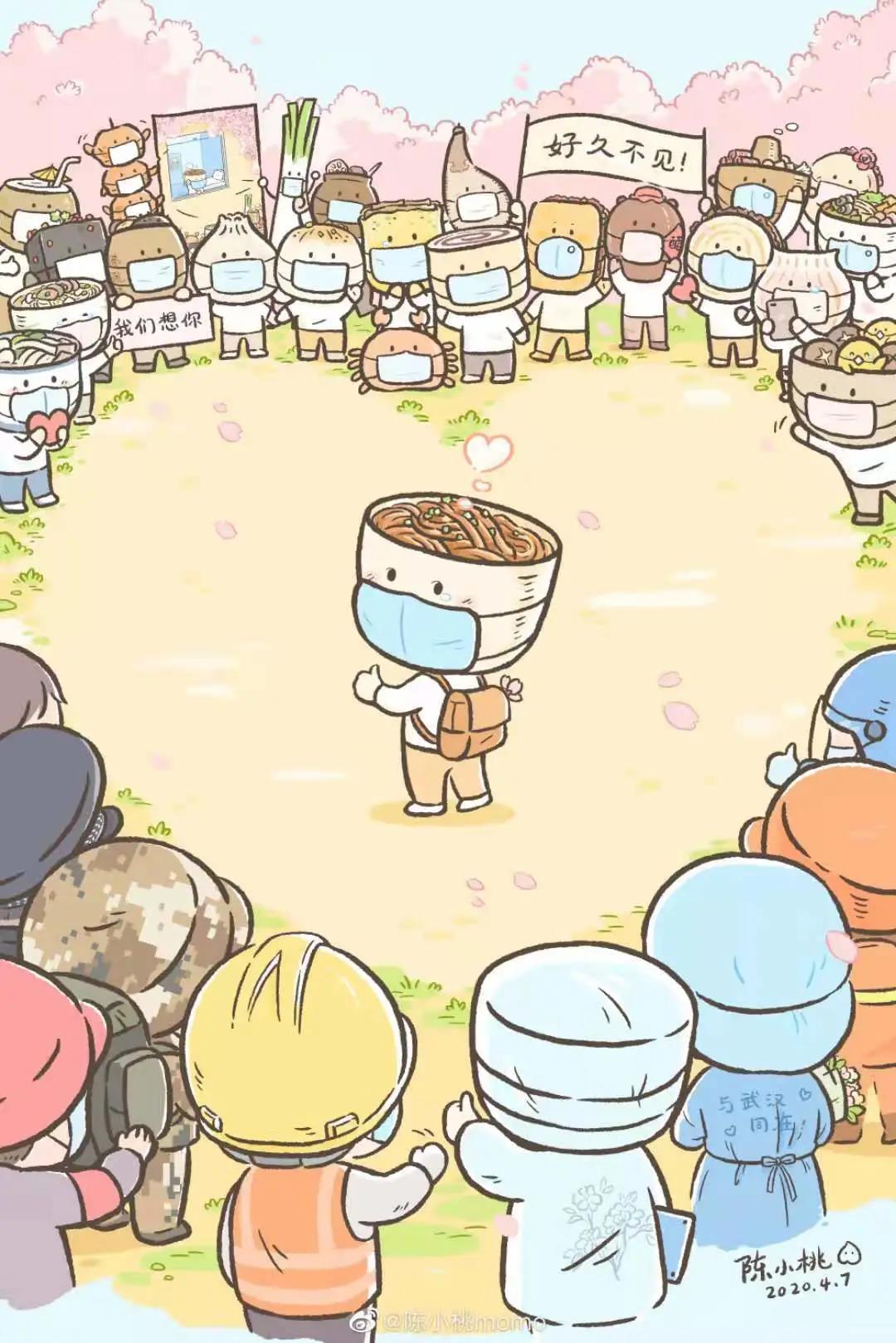 实际上,陈小桃画笔下诞生的暖心火种,燃烧在各个角落。《全国美食为热干面加油》后来以海报的形式张贴在了武汉方舱医院中。全国各地都有人对这幅作品进行临摹、再创作,形成海报、黑板报、公益宣传画等,线上线下再传播。在湖北除武汉市以外解除离鄂通道管控,湖北重启的关键节点,以及武汉解封的重要时刻,“热干面宝宝”的后续故事《热干面醒了》《热干面,好久不见》相继发布后。“每次都能看到网友们团结一致的留言,我想,这就是大家想要表达‘“隔离病毒,不隔离爱’,就像加缪在《鼠疫》中所表述的:洋溢着善意的眼神永远比瘟疫更有力量。”