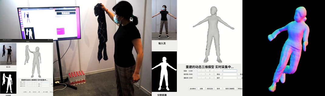 本次博览会上,磁力狗 李坤副教授团队带来“基于单个彩色相机的实时动态人体三维重建与动画”系统展示。在近几年攻关克难所取得的关键技术基础上,研究团队成功研制实时动态人体重建系统,采用单个消费级彩色相机获取人体的彩色图像,实时输出用户的动态三维模型,支持360度浏览与快照。区别于《阿凡达》等影视作品制作所构建的复杂人体采集与重建系统,该系统采用单个消费级彩色相机作为输入,通过轮廓分割、部件识别、几何推断等一系列智能计算,实现实时的动态人体三维重建,从而突破复杂多视角相机重建系统成本高、运维难等制约,具备移动端部署的潜力,赋能面向终端客户的动态人体三维重建技术在远程全息会议、智能电商、虚拟现实和增强现实等领域的应用。