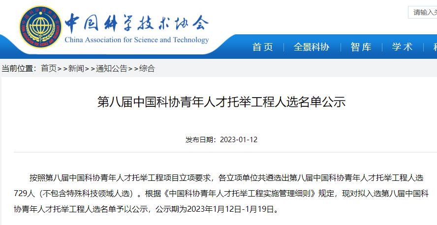 据悉,中国科协青年人才托举工程是中国科协于2015年启动的国家级青年人才计划,主要是扶持有较大创新能力和发展潜力的32岁以下的青年科技人才,助力他们成为高层次领军人才和高水平创新团队的后备军。入选托举培养的对象,中国科协给予每人每年10万元项目经费支持,资助期为3年。