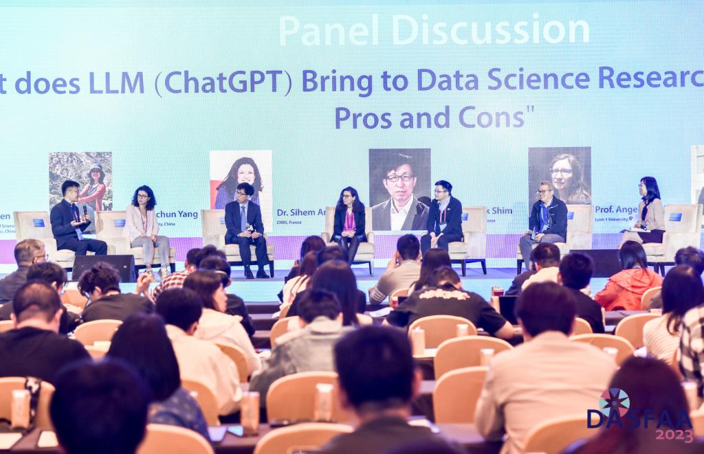 大会组织了主题为“What does LLM (ChatGPT) Bring to Data Science Research and Education? Pros and Cons”的圆桌论坛,热议ChatGPT语言大模型和数据科学研究与教学的关系利弊。香港科技大学(广州)陈雷教授和东北大学杨晓春教授担任本次圆桌论坛的共同主席。论坛嘉宾包括:大会报告讲者Sihem Amer-Yahia博士、Kyuseok Shim教授、Angela Bonifati教授、徐建良教授,以及特邀嘉宾清华大学李国良教授。各位嘉宾通过生动的案例从不同维度充分探讨了以ChatGPT为代表的语言大模型对于数据科学研究和未来教育所带来的影响。
