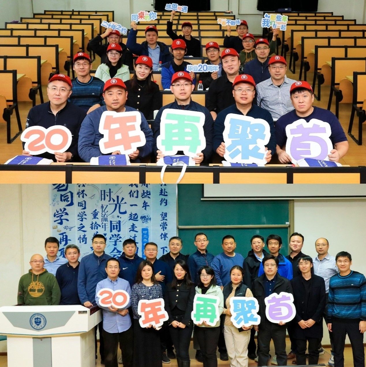 随后校友们来到了十二教学楼,这里是他们曾经上课、自习、备考的地方。走进熟悉的教室,一切仿佛都未曾改变。黑板上还留有未擦去的公式和笔记,课桌椅依旧整齐地排列着,仿佛时光在这里静止了。大家共同观看了精心制作的视频回顾,这段视频记录了他们二十年前的毕业时刻,青涩的面庞、灿烂的笑容、对未来的憧憬与期待,一切都那么真实而生动。随着视频的播放,校友们的思绪也被带回到了那个充满希望的年代。视频结束后,教室里响起了热烈的掌声,那是对过去岁月的致敬,也是对彼此不变情谊的肯定。