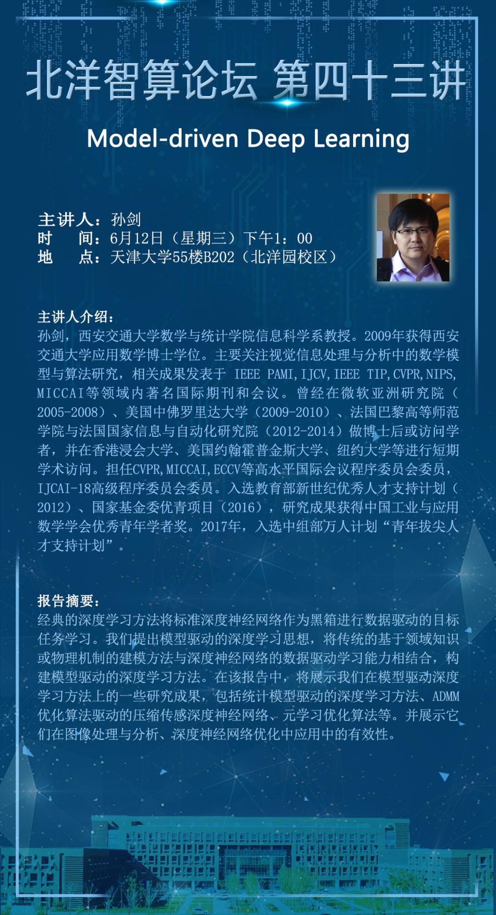 经典的深度学习方法将标准深度神经网络作为黑箱进行数据驱动的目标任务学习。我们提出模型驱动的深度学习思想,将传统的基于领域知识或物理机制的建模方法与深度神经网络的数据驱动学习能力相结合,构建模型驱动的深度学习方法。在该报告中,将展示我们在模型驱动深度学习方法上的一些研究成果,包括统计模型驱动的深度学习方法、ADMM优化算法驱动的压缩传感深度神经网络、元学习优化算法等。并展示它们在图像处理与分析、深度神经网络优化中应用中的有效性。