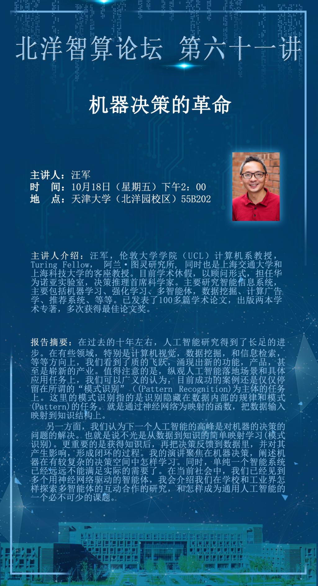 (UCL)计算机系教授,Turing Fellow, 阿兰·图灵研究所, 同时也是上海交通大学和上海科技大学的客座教授。目前学术休假,以顾问形式,担任华为诺亚实验室,决策推理首席科学家。主要研究智能信息系统,主要包括机器学习、强化学习、多智能体,数据挖掘、计算广告学、推荐系统、等等。已发表了100多篇学术论文,出版两本学术专著,多次获得最佳论文奖。