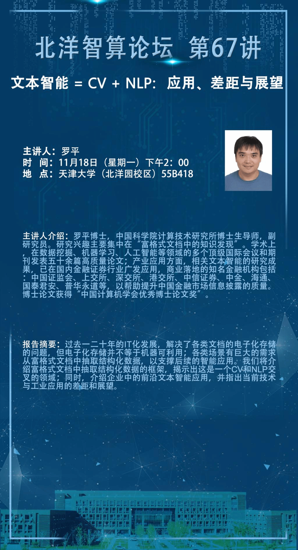 过去一二十年的IT化发展,解决了各类文档的电子化存储的问题,但电子化存储并不等于机器可利用;各类场景有巨大的需求从富格式文档中抽取结构化数据,以支撑后续的智能应用。我们将介绍富格式文档中抽取结构化数据的框架,揭示出这是一个CV和NLP交叉的领域;同时,介绍企业中的前沿文本智能应用,并指出当前技术与工业应用的差距和展望。