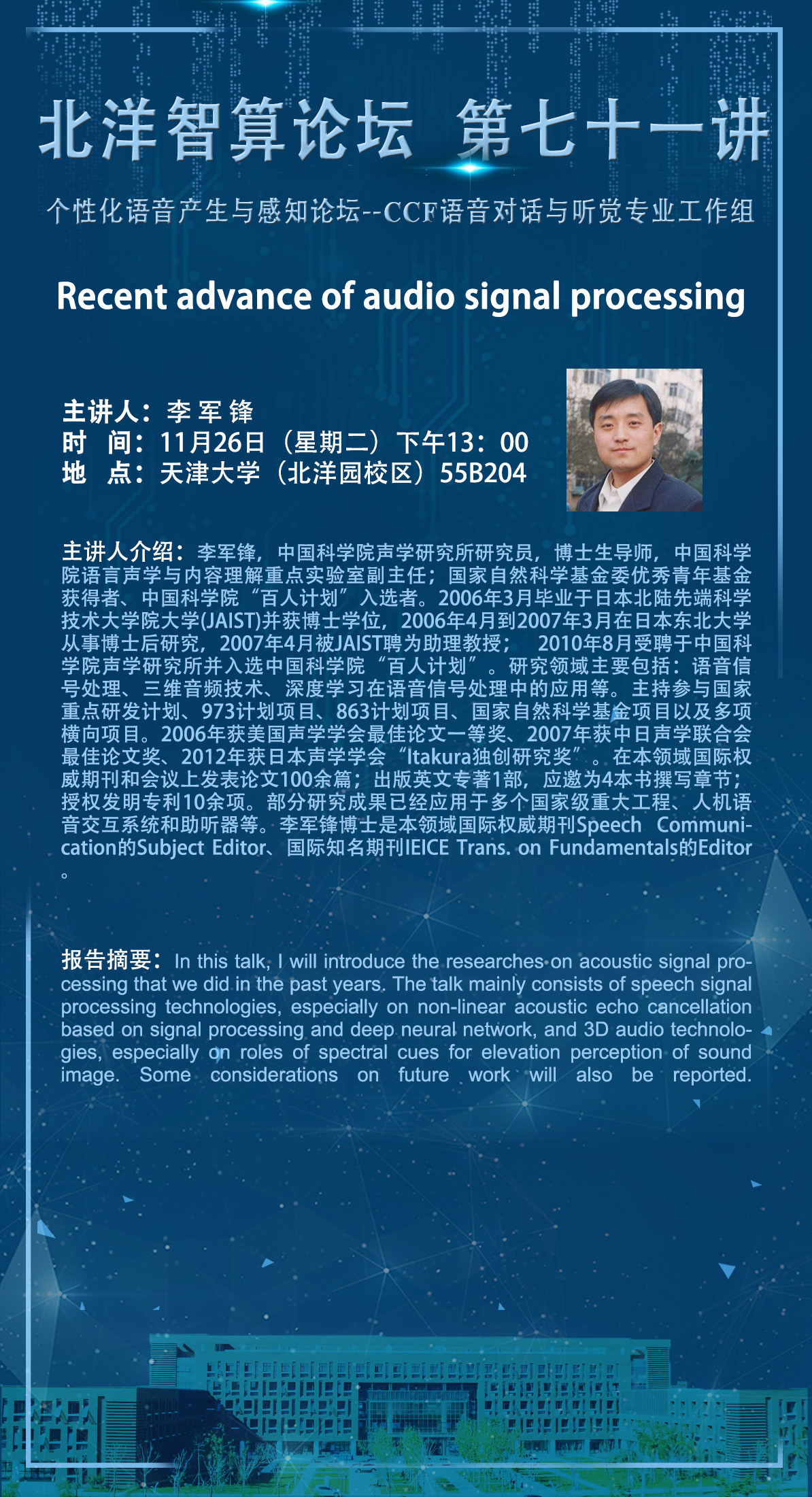 “百人计划”入选者。研究领域主要包括:语音信号处理、三维音频技术、深度学习在语音信号处理中的应用等。主持参与国家重点研发计划、973计划项目、863计划项目、国家自然科学基金项目以及多项横向项目。在本领域国际权威期刊和会议上发表论文100余篇;出版英文专著1部,应邀为4本书撰写章节;授权发明专利10余项。部分研究成果已经应用于多个国家级重大工程、人机语音交互系统和助听器等。李军锋博士是本领域国际权威期刊Speech Communication的Subject Editor、国际知名期刊IEICE Trans. on Fundamentals的Editor。