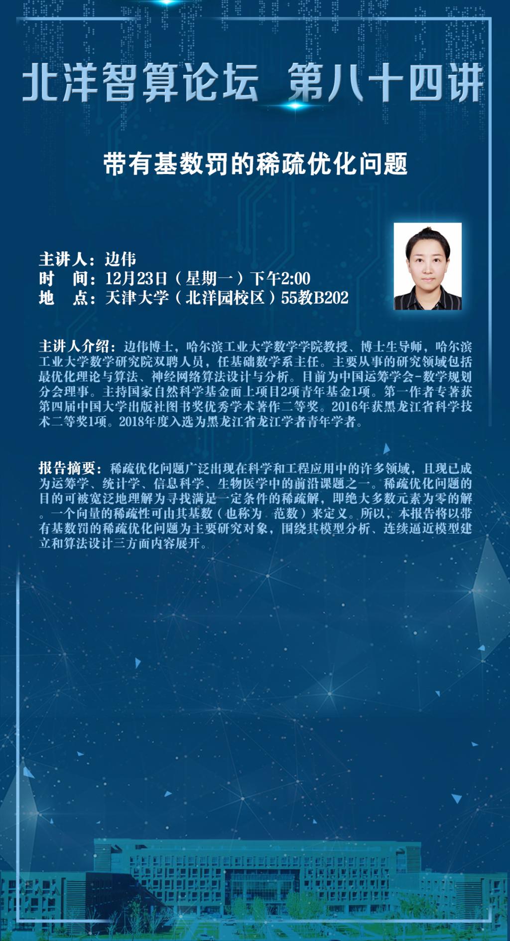 稀疏优化问题广泛出现在科学和工程应用中的许多领域,且现已成为运筹学、统计学、信息科学、生物医学中的前沿课题之一。稀疏优化问题的目的可被宽泛地理解为寻找满足一定条件的稀疏解,即绝大多数元素为零的解。一个向量的稀疏性可由其基数(也称为 范数)来定义。所以,本报告将以带有基数罚的稀疏优化问题为主要研究对象,围绕其模型分析、连续逼近模型建立和算法设计三方面内容展开。