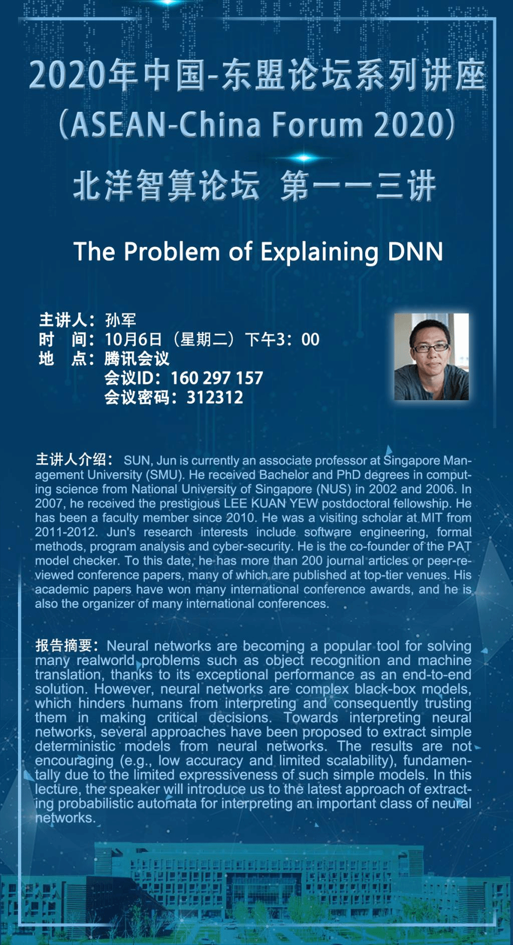 SUN, Jun is currently an associate professor at Singapore Management University (SMU). He received Bachelor and PhD degrees in computing science from National University of Singapore (NUS) in 2002 and 2006. In 2007, he received the prestigious LEE KUAN YEW postdoctoral fellowship. He has been a faculty member since 2010. He was a visiting scholar at MIT from 2011-2012. Jun's research interests include software engineering, formal methods, program analysis and cyber-security. He is the co-founder of the PAT model checker. To this date, he has more than 200 journal articles or peer-reviewed conference papers, many of which are published at top-tier venues. His academic papers have won many international conference awards, and he is also the organizer of many international conferences.