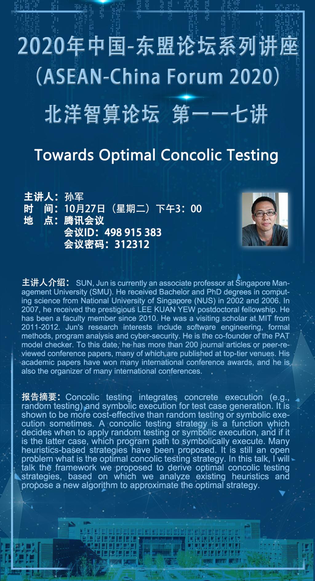 SUN, Jun is currently an associate professor at Singapore Management University (SMU). He received Bachelor and PhD degrees in computing science from National University of Singapore (NUS) in 2002 and 2006. In 2007, he received the prestigious LEE KUAN YEW postdoctoral fellowship. He has been a faculty member since 2010. He was a visiting scholar at MIT from 2011-2012. Jun's research interests include software engineering, formal methods, program analysis and cyber-security. He is the co-founder of the PAT model checker. To this date, he has more than 200 journal articles or peer-reviewed conference papers, many of which are published at top-tier venues. His academic papers have won many international conference awards, and he is also the organizer of many international conferences.