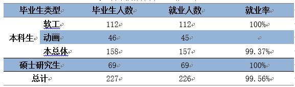 2017届毕业生共227人。其中本科生158人,占毕业生总人数69.6%(软件工程专业112人,占本科毕业生70.89%。动画专业46人,占本科生毕业生29.11%)。硕士研究生69人,占毕业生总人数30.4%。