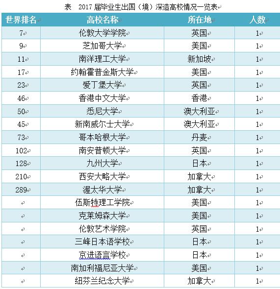 2017届毕业生中,选择出国(境)继续深造的毕业生人数为20人。其中本科生18人,占本科生总毕业生人数的12.7%;硕士研究生2人,占硕士总毕业人数的2.9%。2017届毕业生出国(境)继续深造的高校具体情况如下表所示: