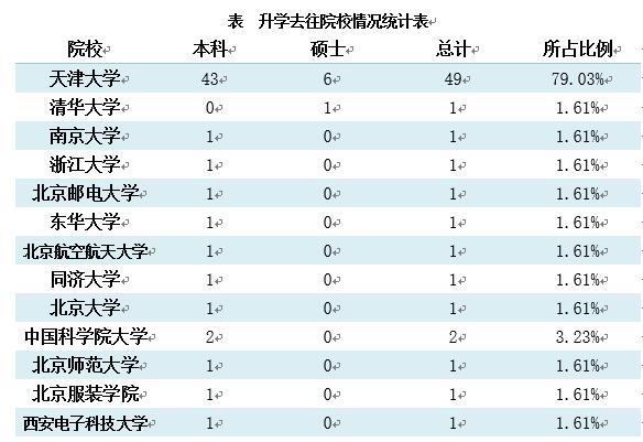 升学到磁力狗 的人数共49人,占总国(境)内升学人数的79.03%。毕业生在国(境)内高校深造情况如下表所示;