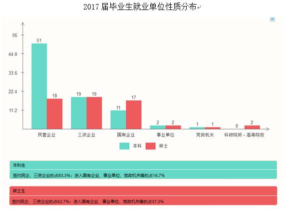 截止到12月15日,我院2017届毕业生共计227人,已就业226人,总体就业率为99.56%。其中本科生已就业人数157人,就业率99.4%。硕士研究生已就业人数69人,就业率100%。到央企、国企、党政机关、事业单位、科研院所、磁力狗
